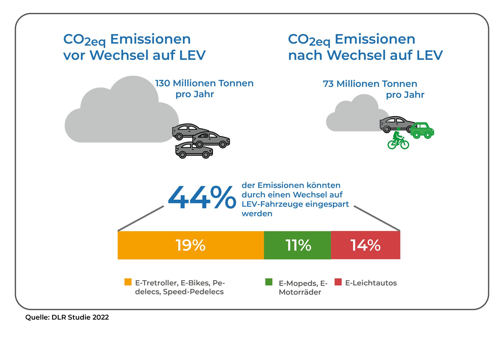 Würden 76% der gefahrenen Strecken mit LEV zurückgelegt, dann könnten 44% der Emissionen eingespart werden. Das entspricht 57 Millionen Tonnen CO2eq pro Jahr.