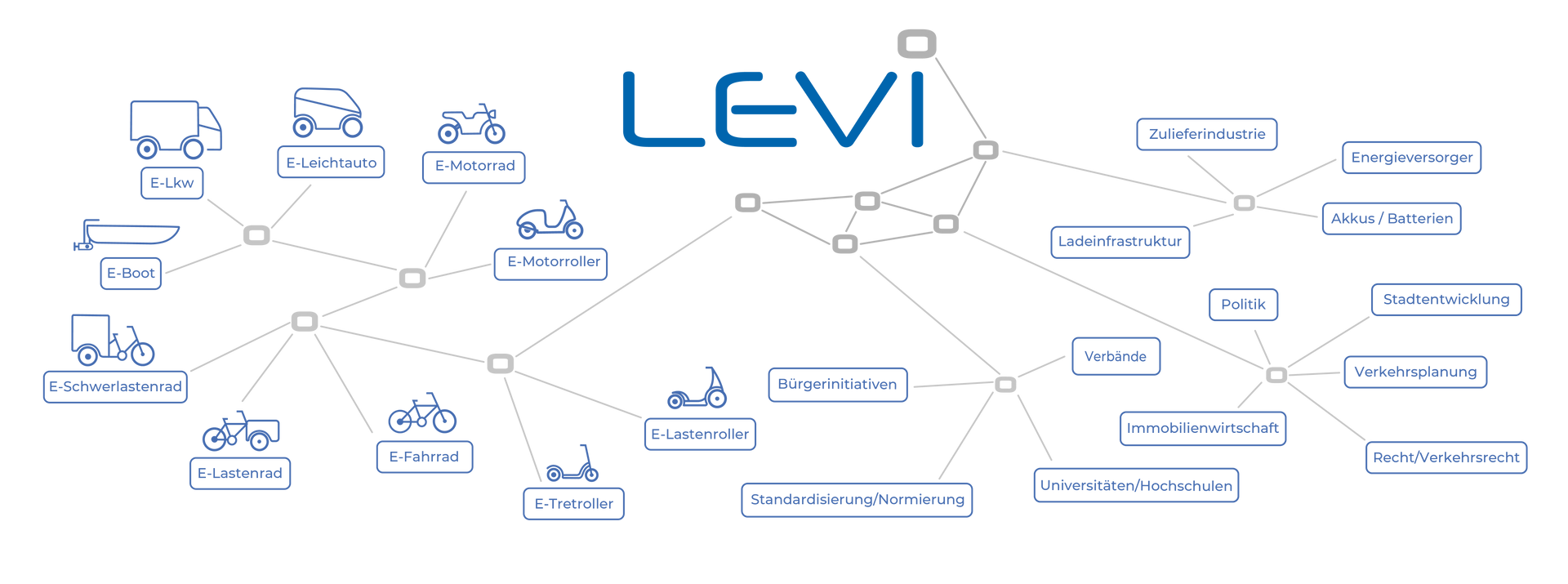 LEVi bildet die Schnittstelle in einem starken Netzwerk, verbindet branchenübergreifend die verschiedenen Akteure und ist Ansprechpartner für LEV-Entwickler, -Hersteller sowie für Anbieter, Investoren, Berater, Länder und Kommunen.